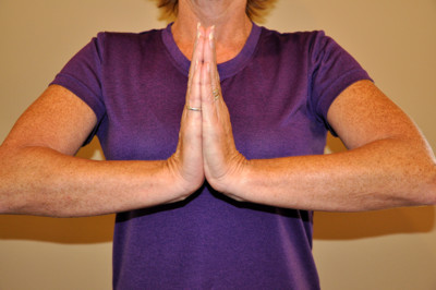 Stań lub usiądź wygodnie. Wyciągnij obie ręce przed siebie na wysokości klatki piersiowej. Złącz dłonie stronami dłoniowymi, palce skierowane do góry – jak do modlitwy. Z tej pozycji powoli przyciągnij dłonie w kierunku klatki piersiowej, aż poczujesz rozciąganie w obrębie nadgarstków i przedramion. Łokcie kierują się lekko na zewnątrz, barki pozostają rozluźnione.